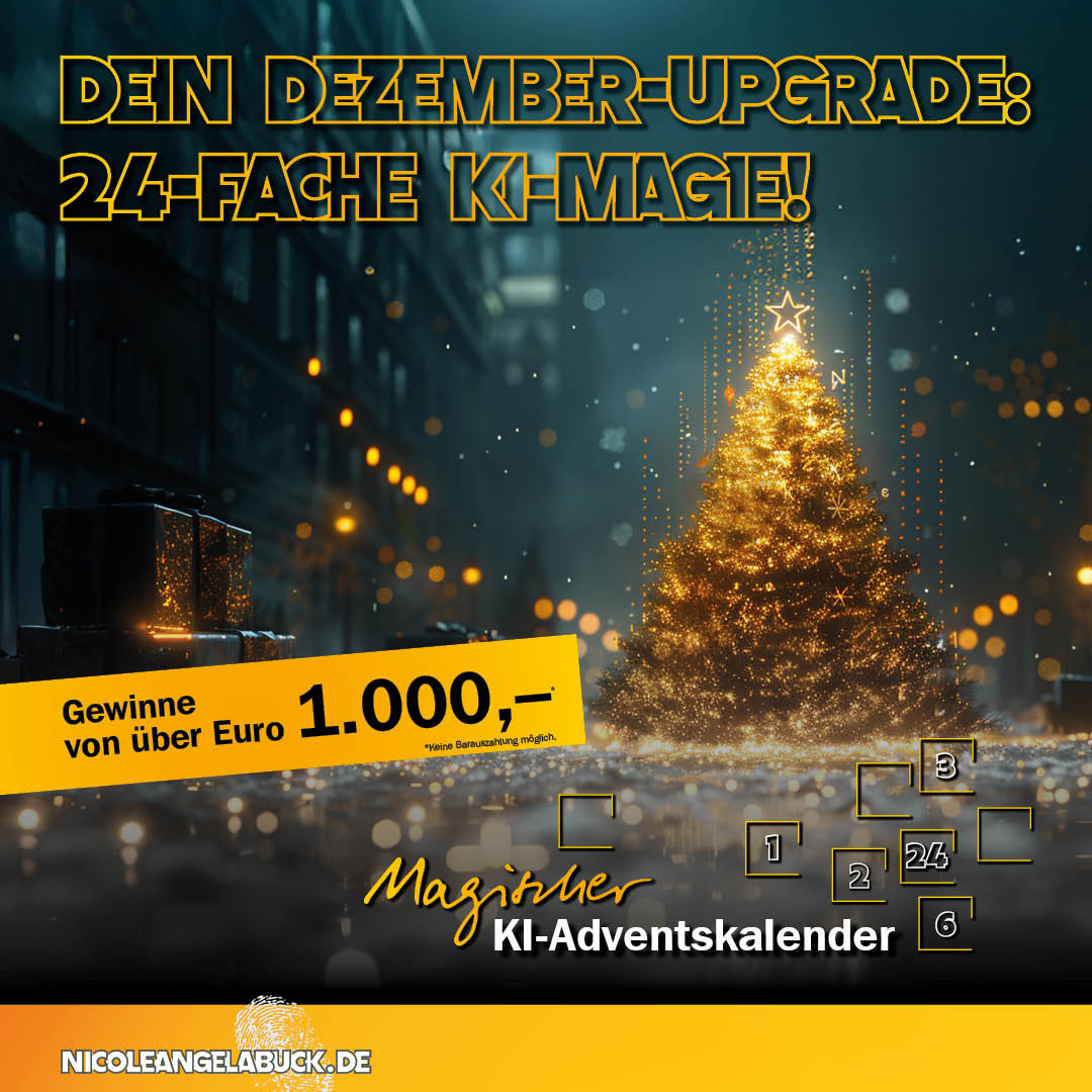 Möchtest Du Teil dieser besonderen Adventszeit werden? Dann melde Dich jetzt für meinen magischen KI-Adventskalender 2024 an. Lass uns gemeinsam die Vorweihnachtszeit nutzen, um Deinen Content auf ein neues Level zu heben.