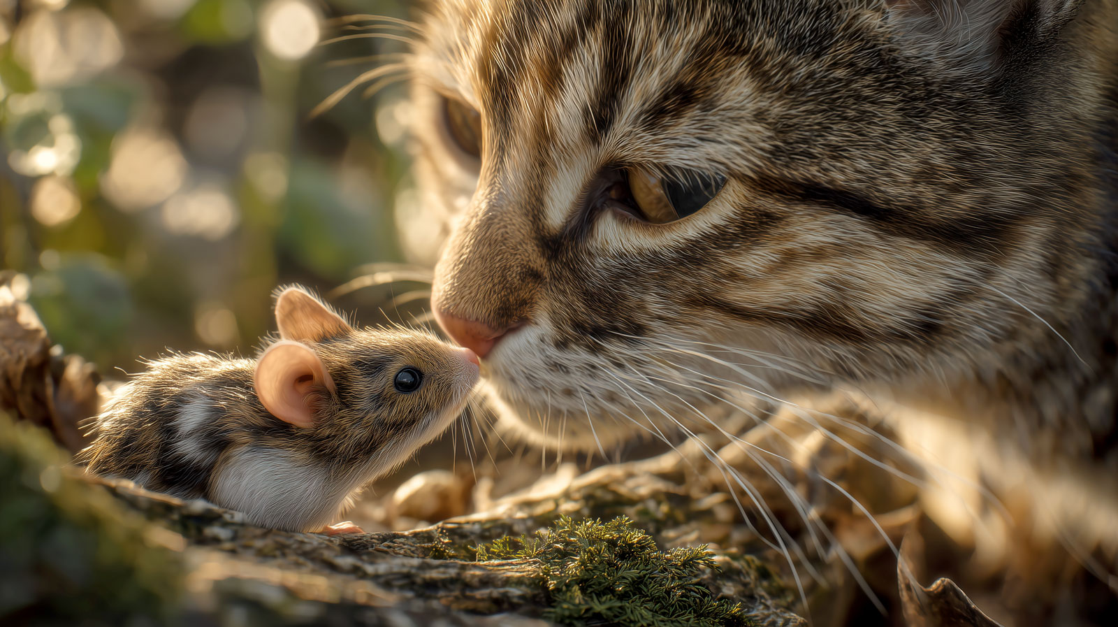 "A realistic scene of a cat and a mouse kissing each other, set in nature, shown from an unusual low angle (frog perspective), with gentle artificial lighting and a calm, peaceful mood. Slight depth of field for soft background blur. The image is in natural colors, highly realistic, wide landscape format, both animals are the clear main subjects. --ar 16:9"