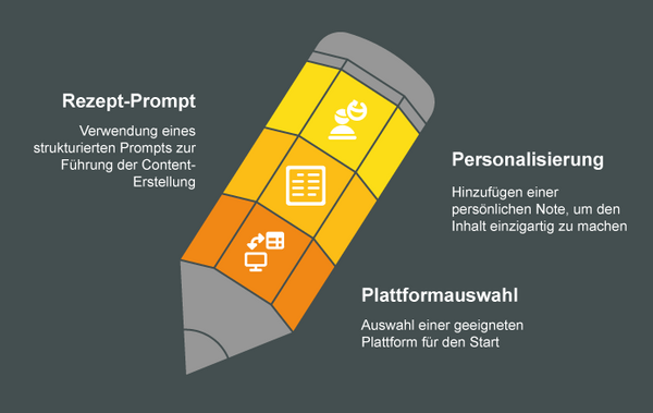 Starte mit einem konkreten Format, wähl zum Beispiel LinkedIn, Newsletter oder Blog. Nicht alles auf einmal. Dann nutze den „Rezept"-Prompt mit Thema, Zielgruppe, Ziel und Ton.