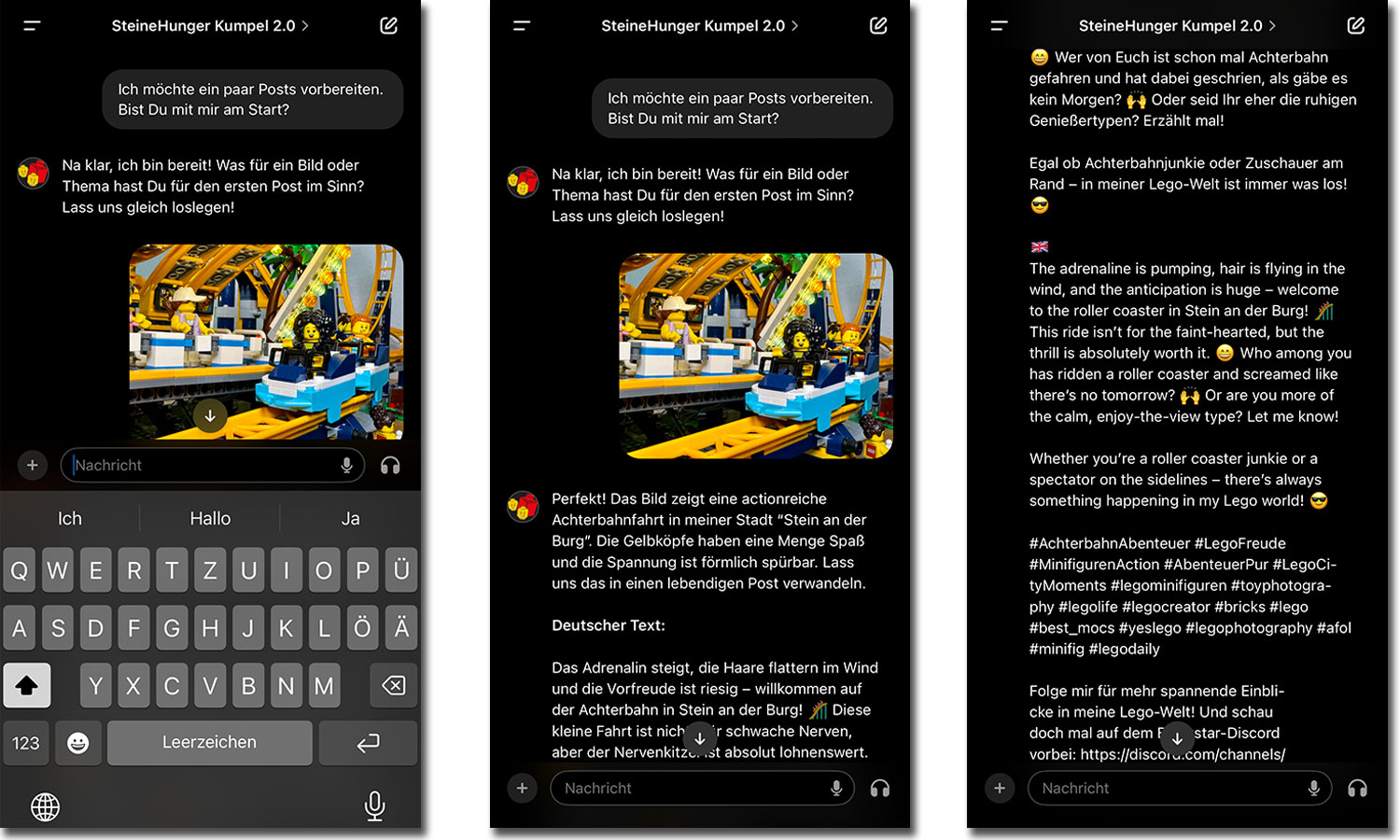 Mein "Steinehunger-Trick": Für meinen privaten Instagram-Kanal, auf dem ich meine LEGO-Bauwerke zeige, habe ich einen CustomGPT entwickelt. Ich lade einfach ein Foto hoch - und in 98% der Fälle habe ich sofort einen fertigen Post. Einmal drüberlesen, ins Planungstool kopieren, Bild dazu - fertig.